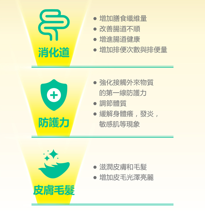 腸胃保健、幫助消化、增強防護力、毛髮保健幫助皮膚健康、每包添加60億活菌(益生菌+益生元)