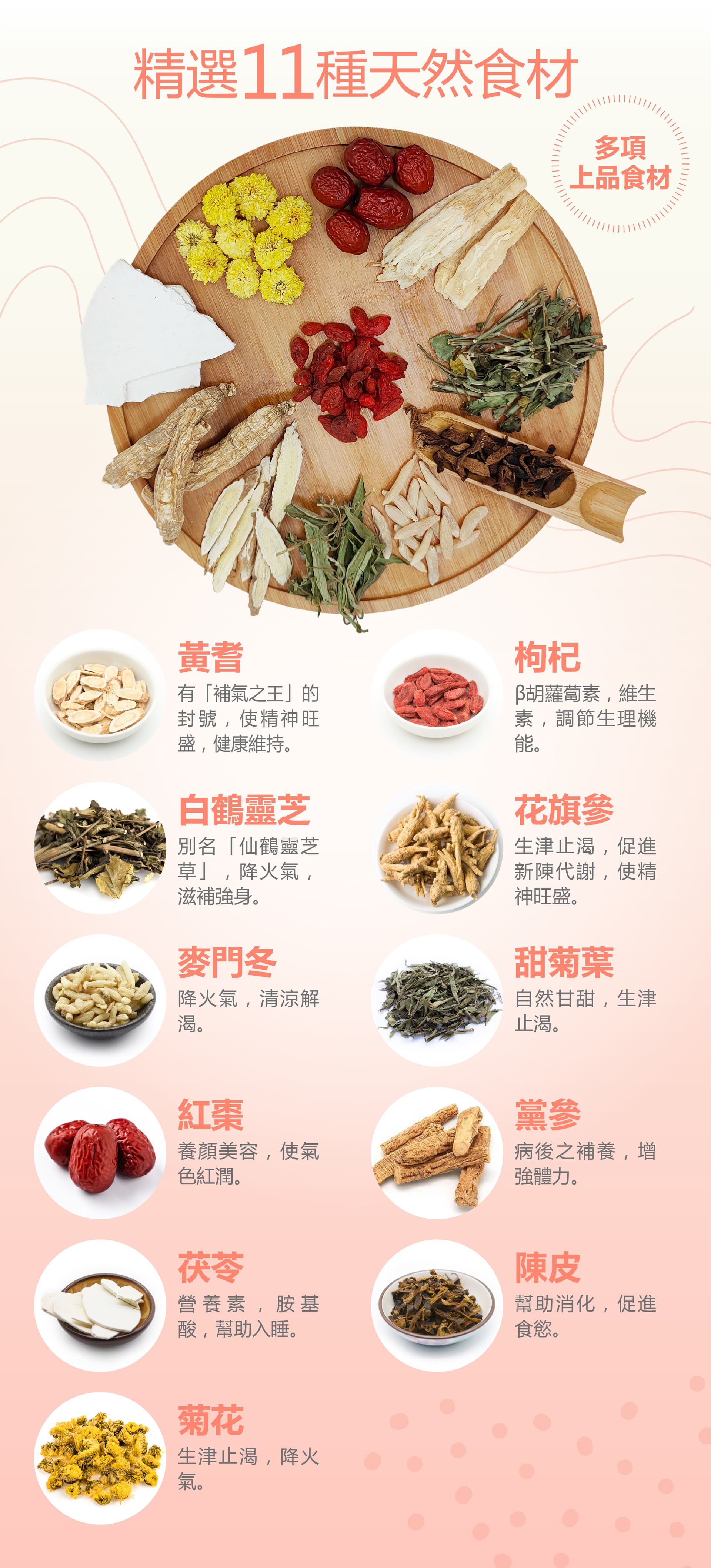 花旗參,菊花,茯苓,白鶴靈芝,黃耆,黨參,麥門冬,陳皮,紅棗,枸杞,甜菊葉