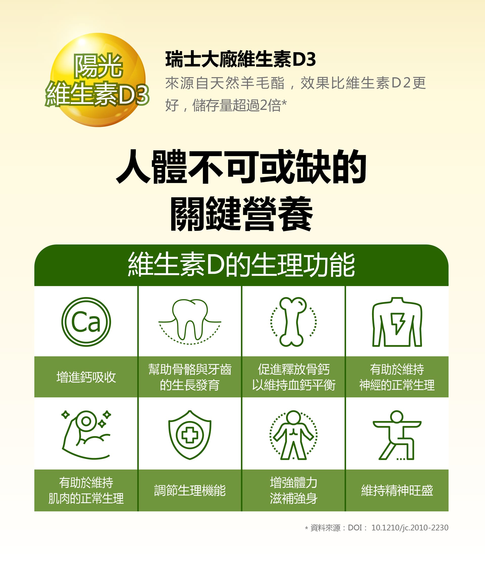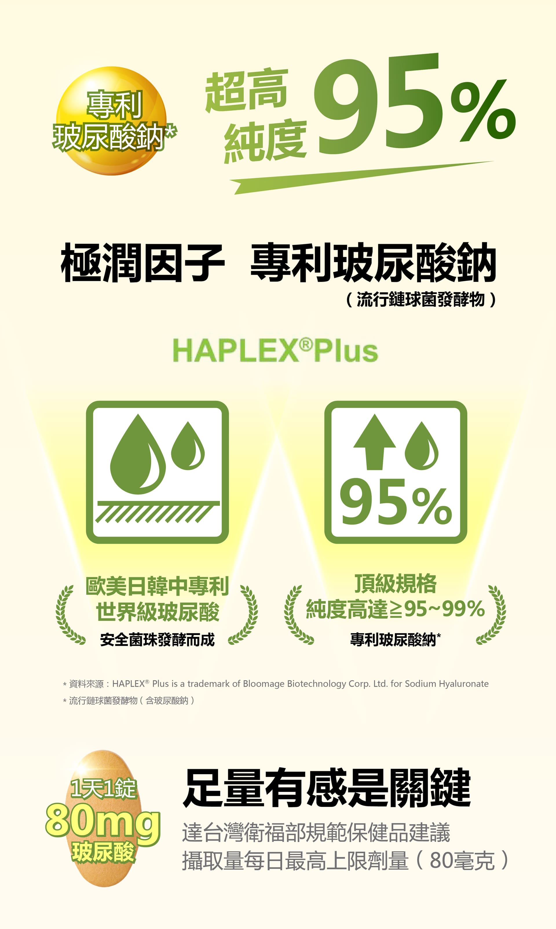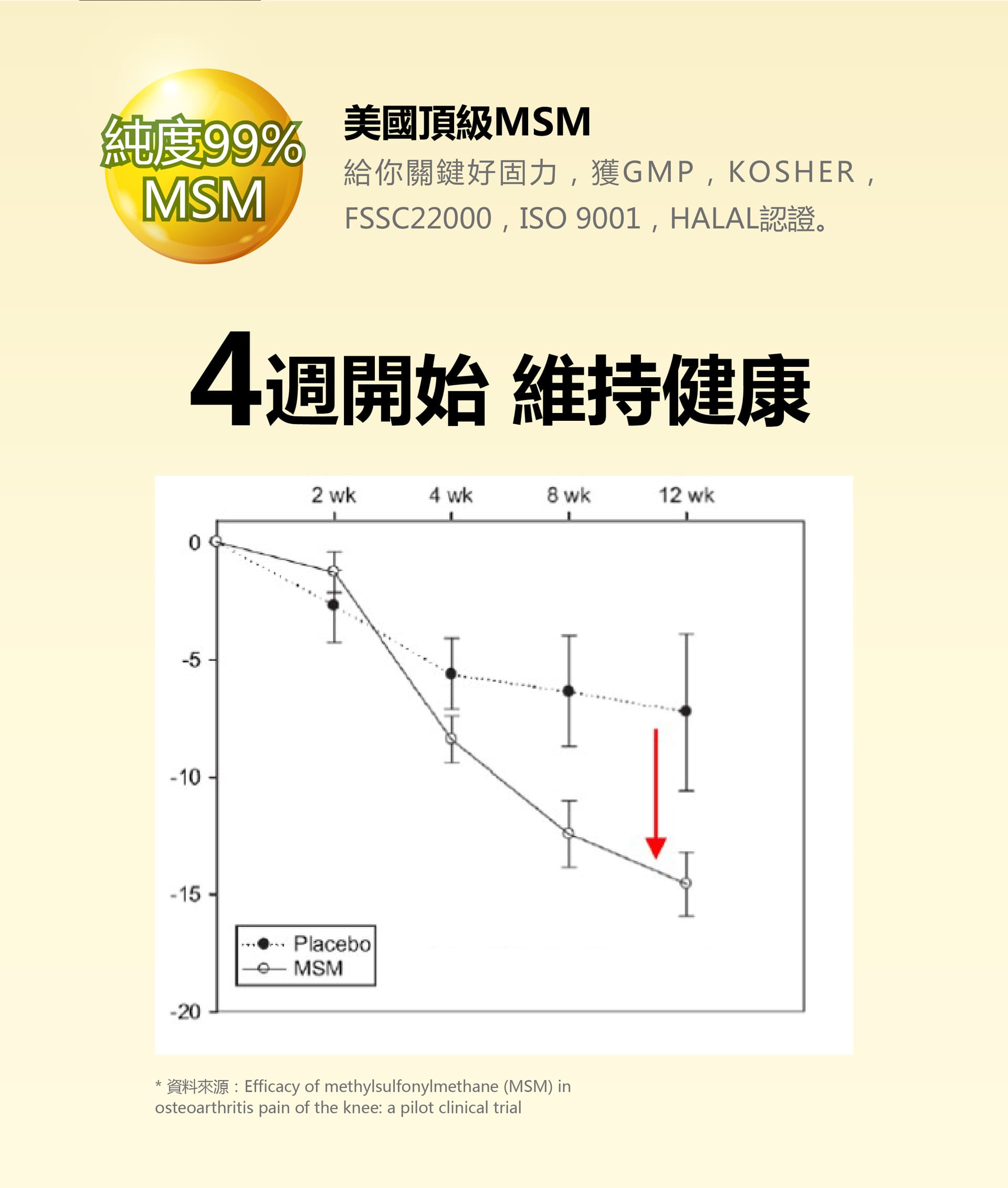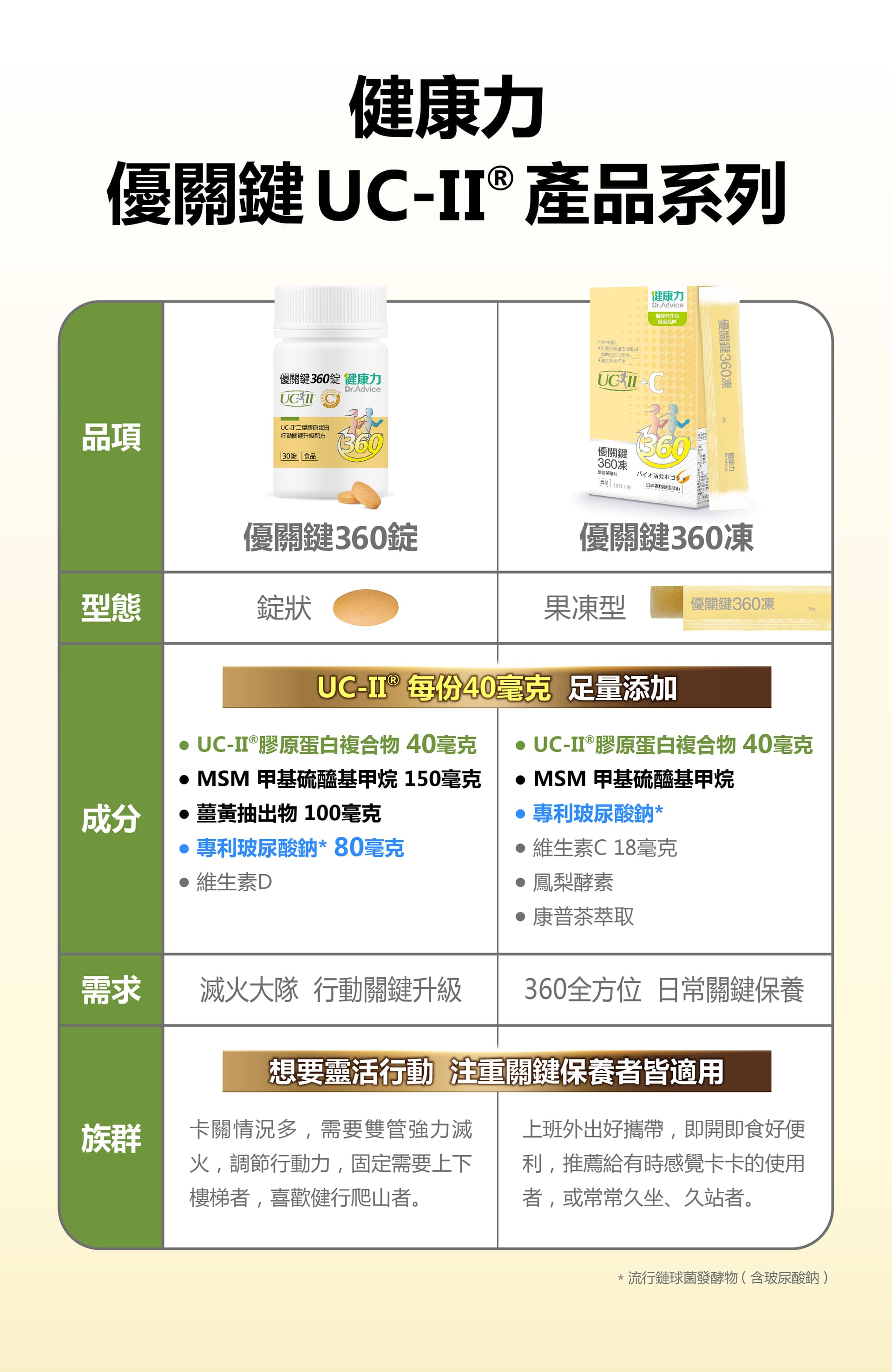微結晶狀α-纖維素、甲基硫醯基甲烷(甲基硫醯基甲烷、二氧化矽)、薑黃抽出物、流行鏈球菌發酵物(含透明質酸鈉)、UC-II®膠原蛋白複合物【雞胸軟骨(含二型膠原蛋白)、氯化鉀】、硬脂酸鎂、維生素D3【修飾澱粉(辛烯基丁二酸鈉澱粉)、蔗糖、抗壞血酸鈉(維生素C)(抗氧化劑)、中鏈三酸甘油酯、二氧化矽、維生素E(抗氧化劑)、膽鈣化醇(維生素D3)】、二氧化矽。膜衣成分:白色水性膜衣(聚乙烯醇、滑石粉、二氧化鈦、脂肪酸甘油脂、硫酸月桂酯鈉)、食用黃色四號鋁麗基、食用黃色五號鋁麗基、二氧化鈦。作用