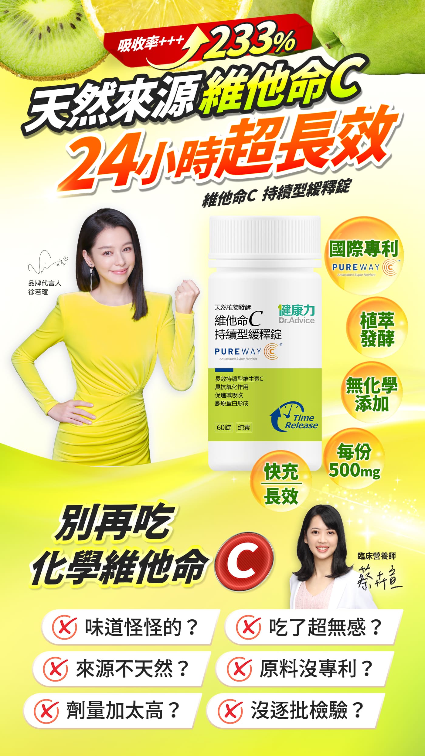 PUREWAY-C®複方維生素C【抗壞血酸(維生素C)、柑橘萃取物、米糠粉】、羥丙基甲基纖維素、微結晶狀α-纖維素、聚乙烯吡咯烷酮、白色水性膜衣(聚乙烯醇、滑石粉、二氧化鈦、脂肪酸甘油酯、硫酸月桂酯鈉)、硬脂酸鎂、二氧化矽、食用黃色四號鋁麗基、二氧化鈦、食用黃色五號鋁麗基作用