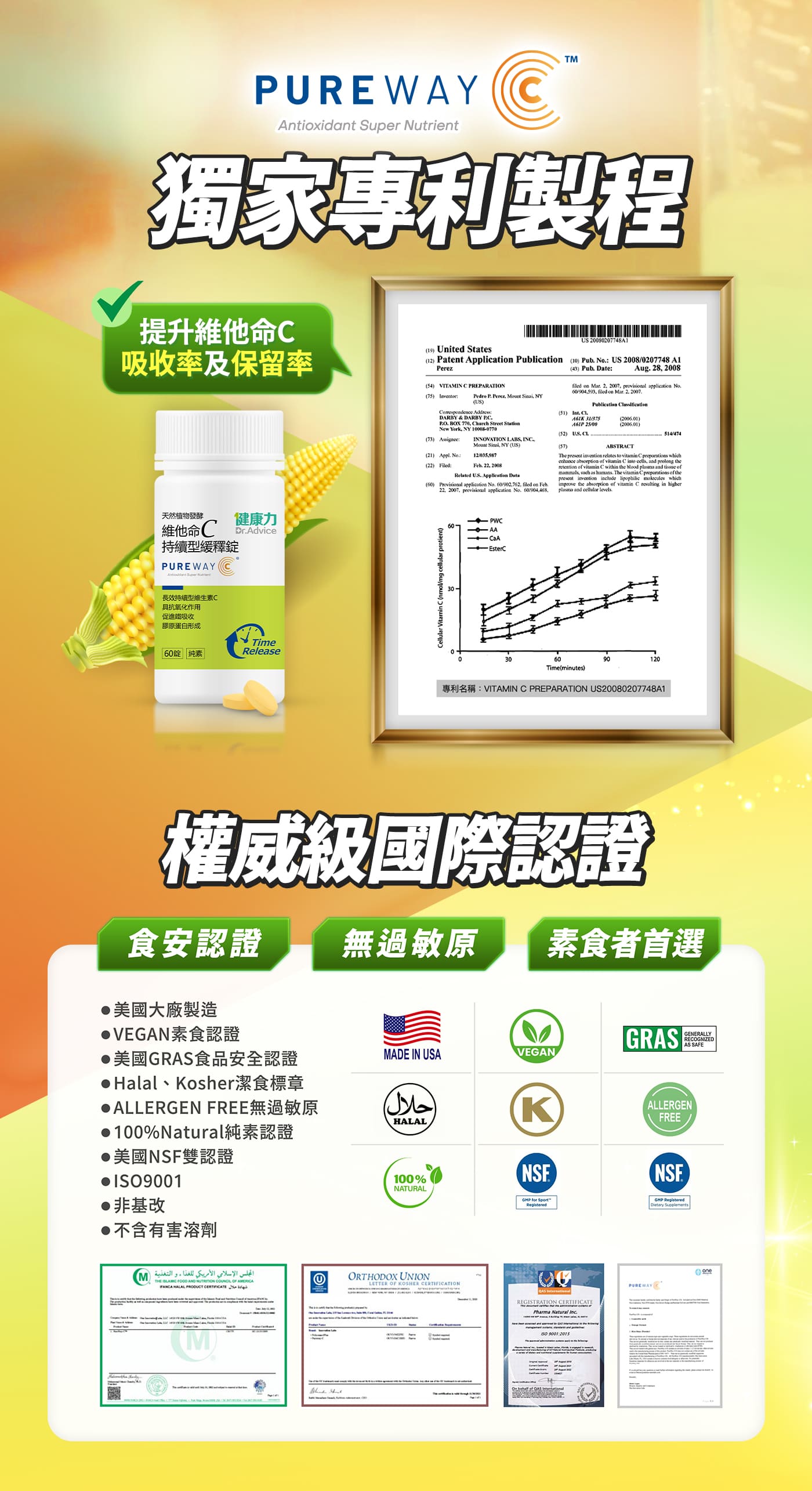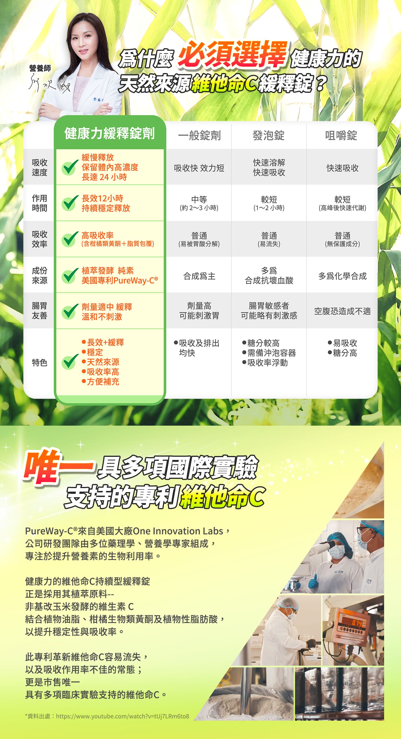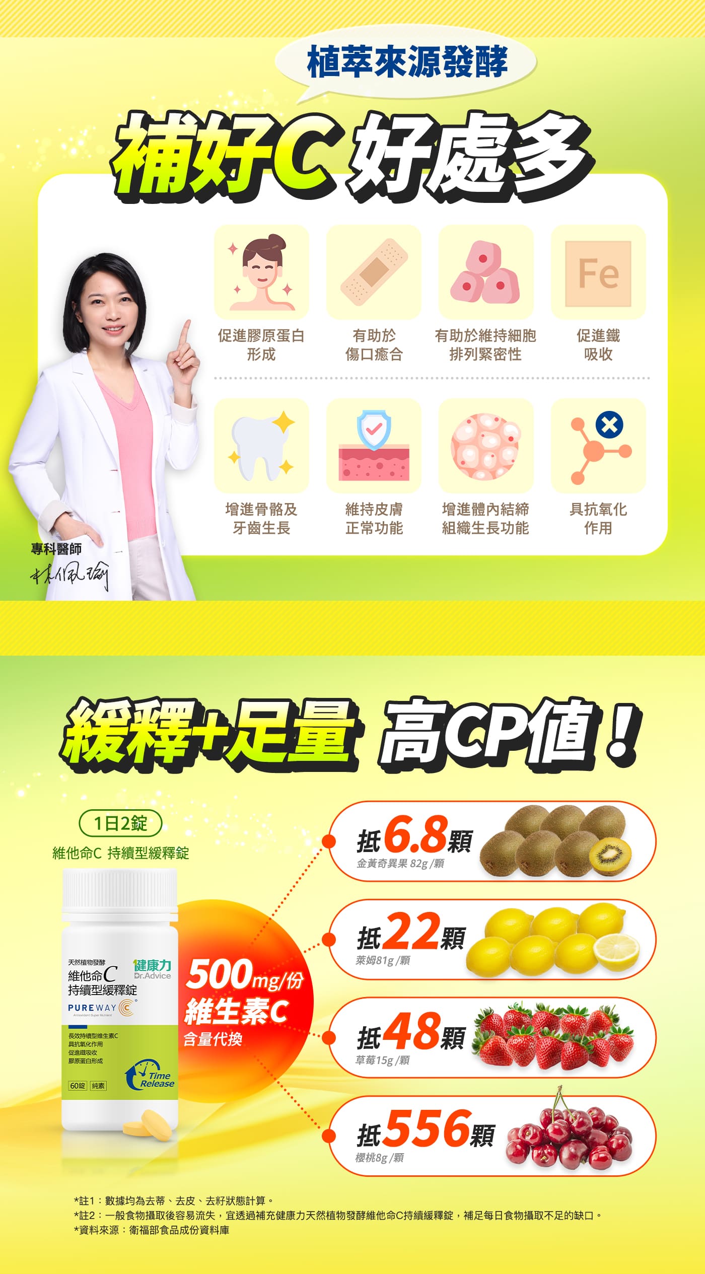 促進膠原蛋白形成、有助於傷口癒合、增進骨骼及牙齒生長、維持皮膚正常功能、促進鐵吸收、具抗氧化作用產品容量