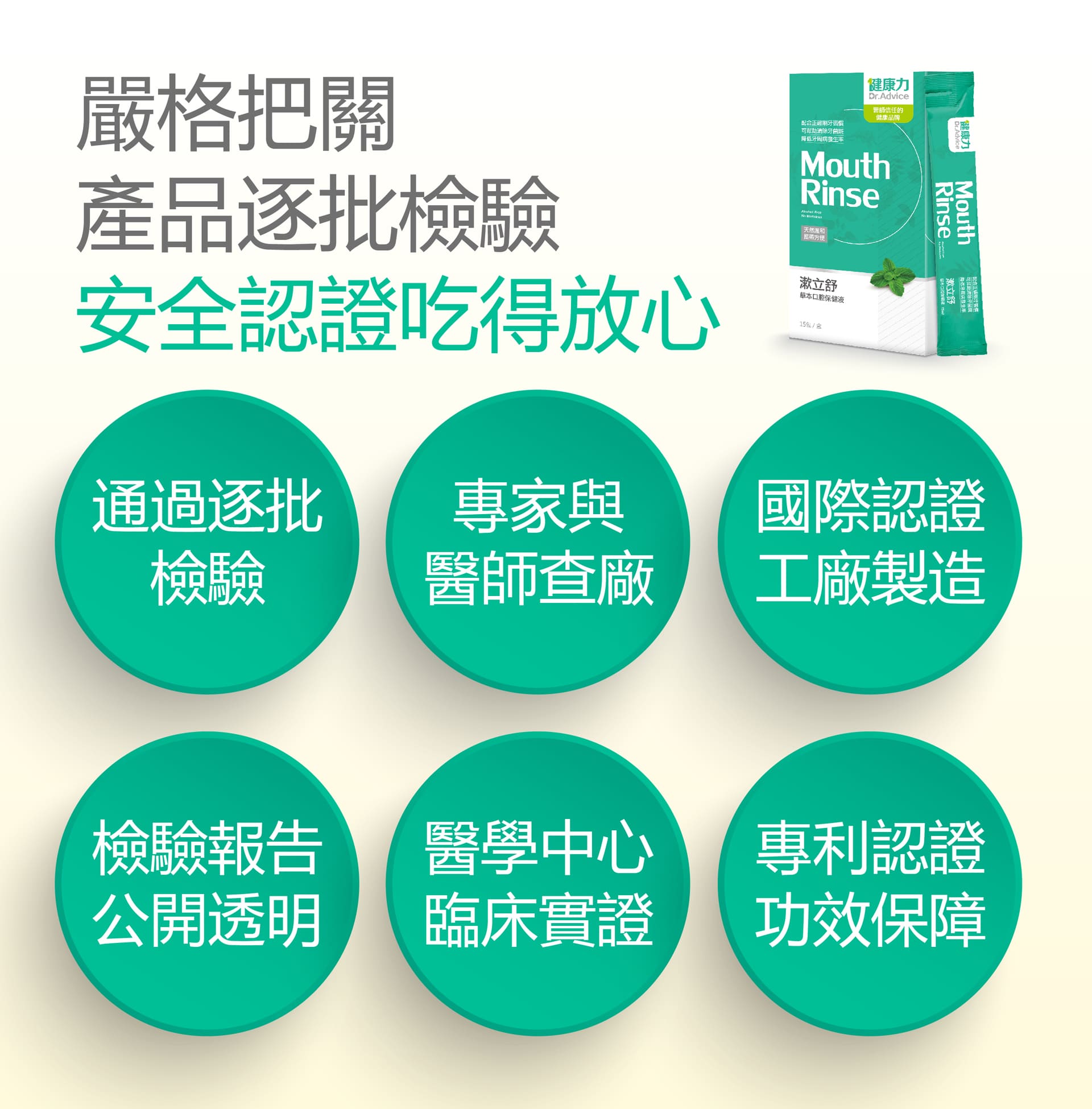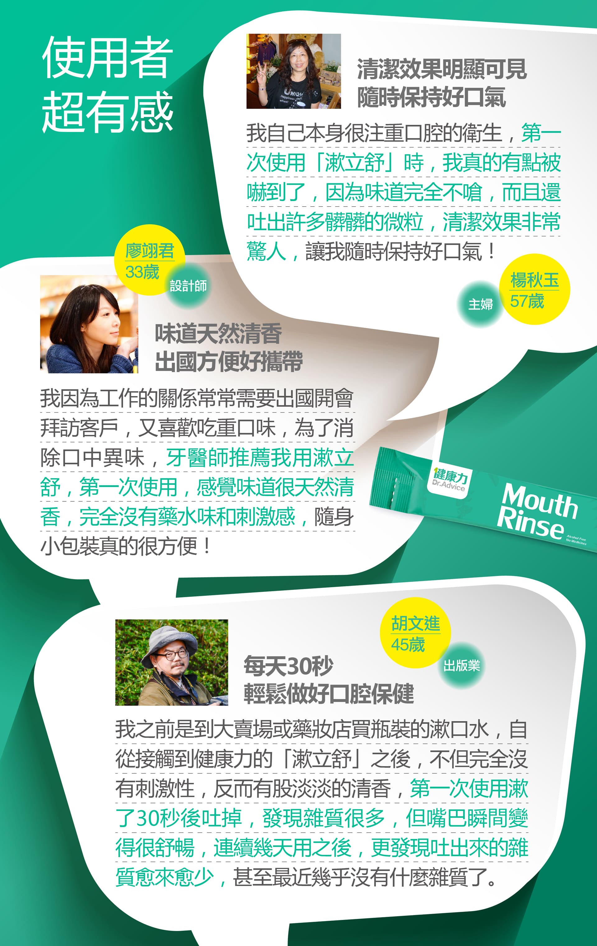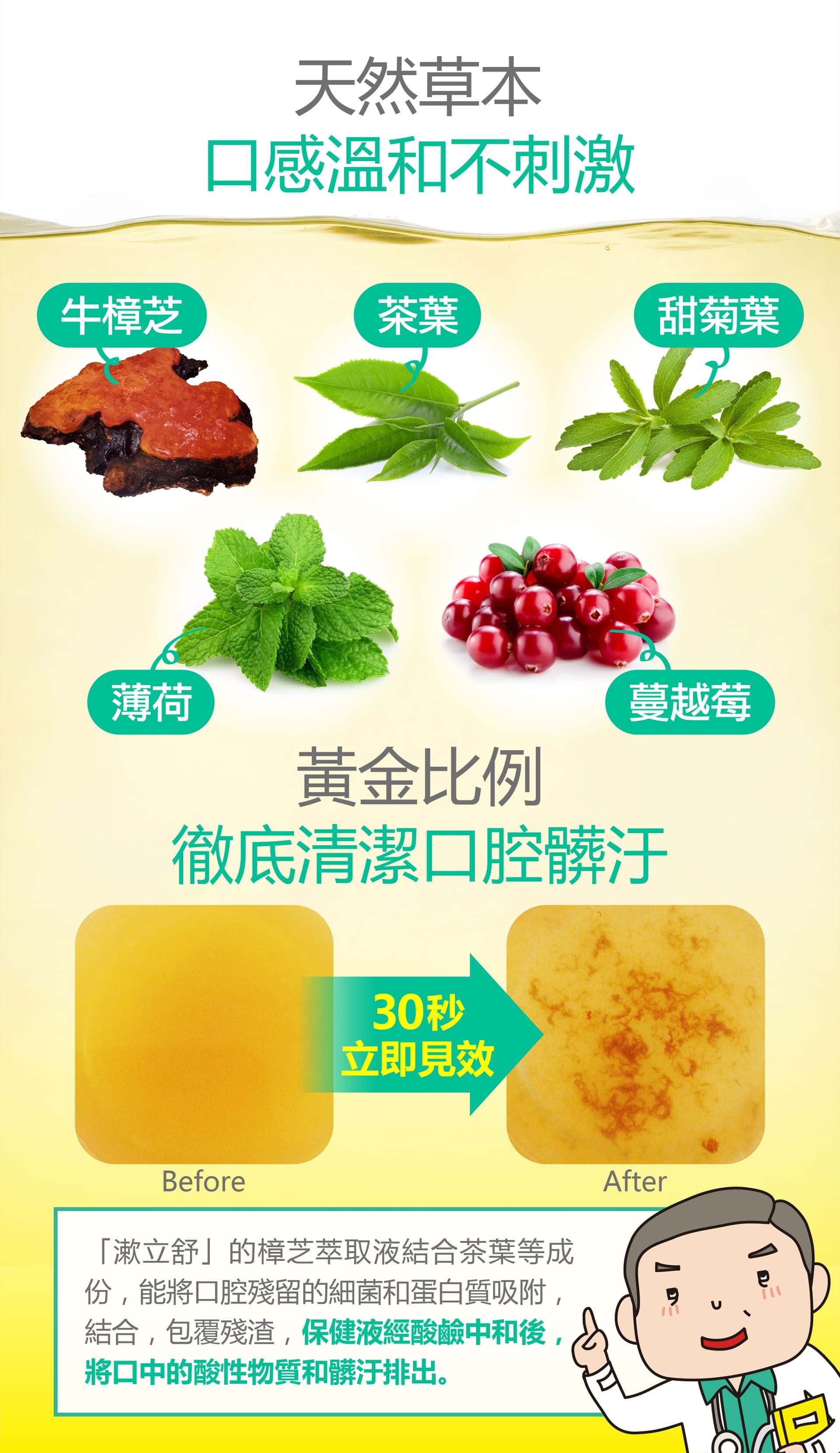 漱立舒可淨化口腔、去除口腔異味,配合正確刷牙習慣,可控制牙菌斑及預防牙周病,輕鬆養成口腔保健好習慣!