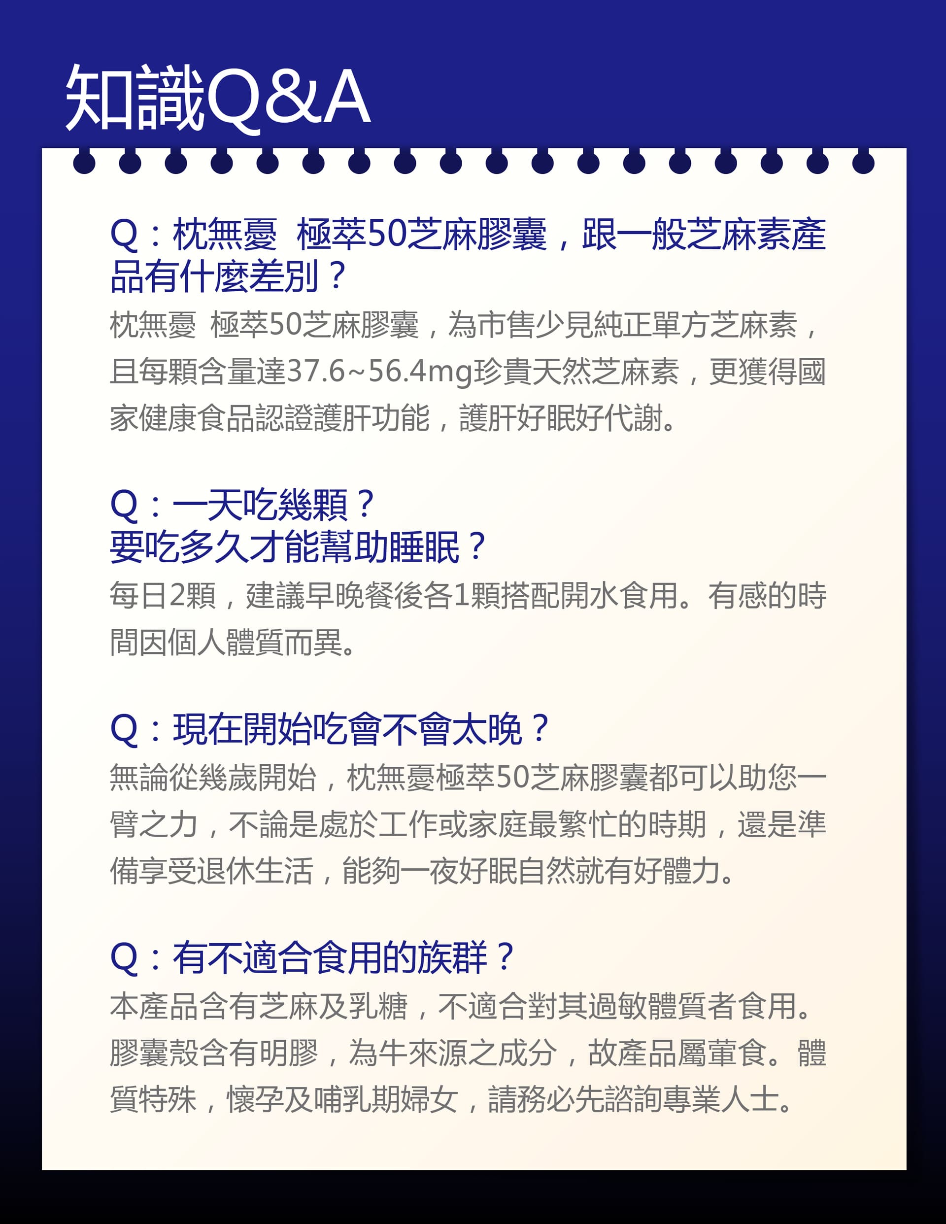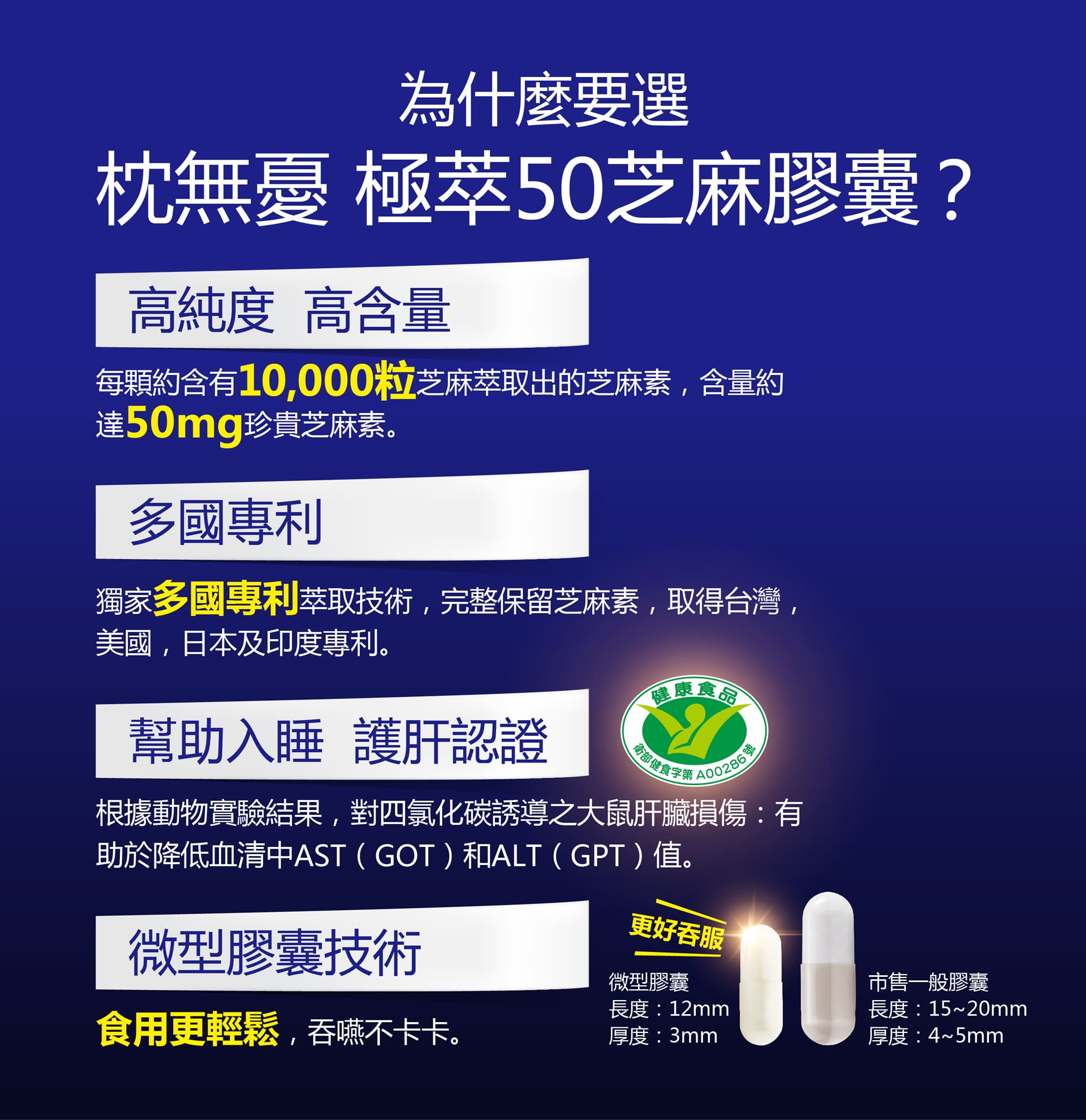 護肝功效(健康食品認證),幫助入睡,保持好氣色好心情。每1顆含芝麻素37.6~56.4毫克,為市售稀有高含量產品。產品容量