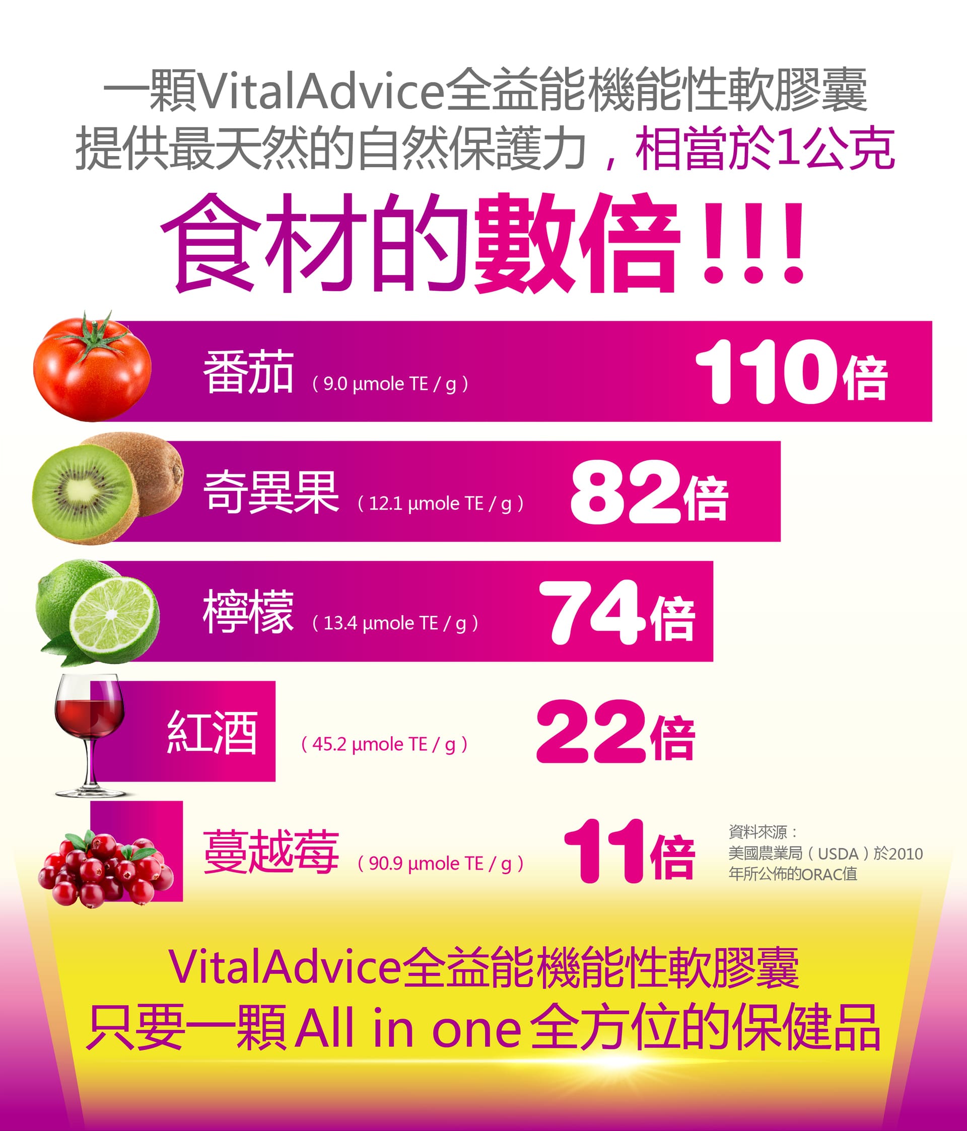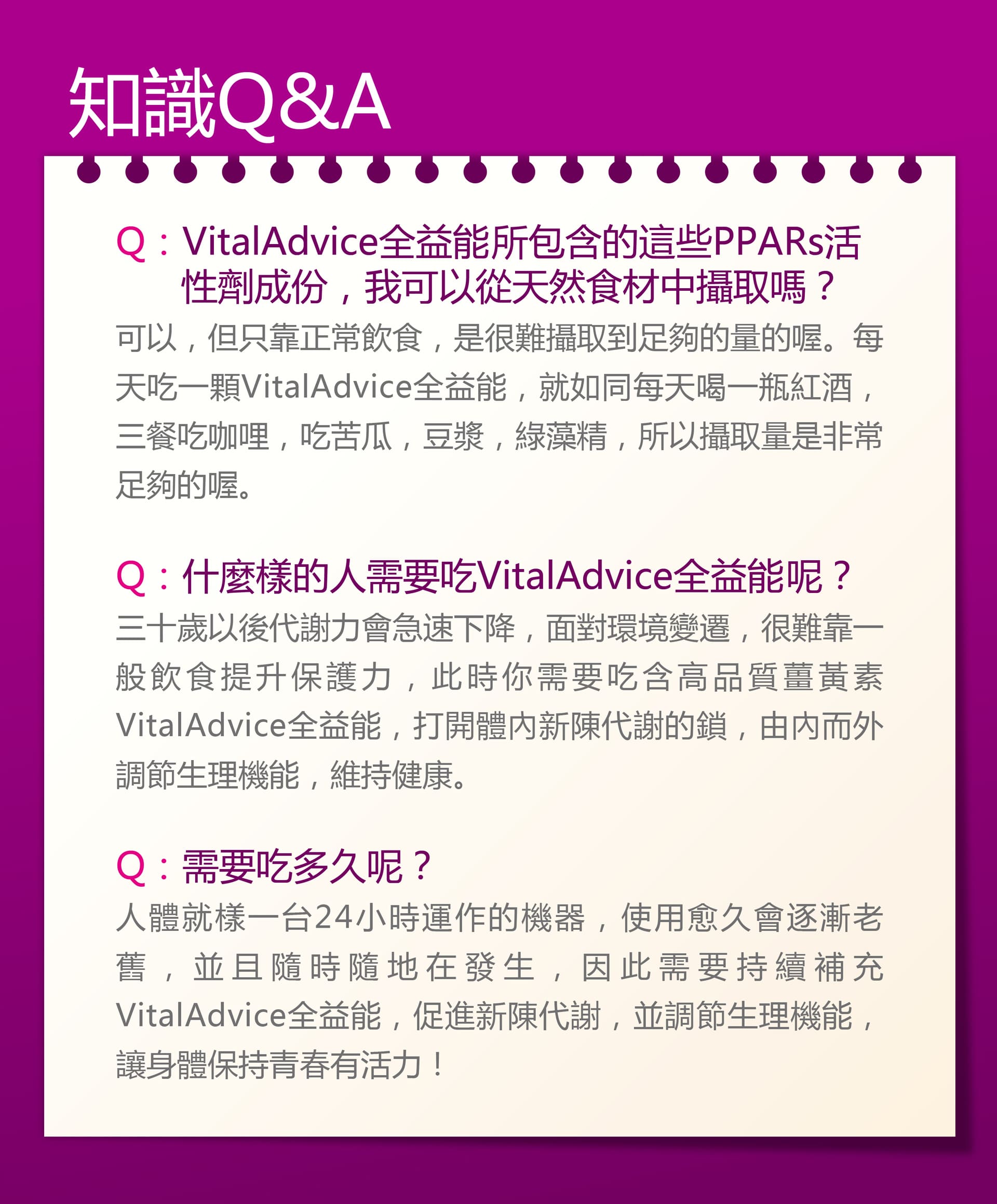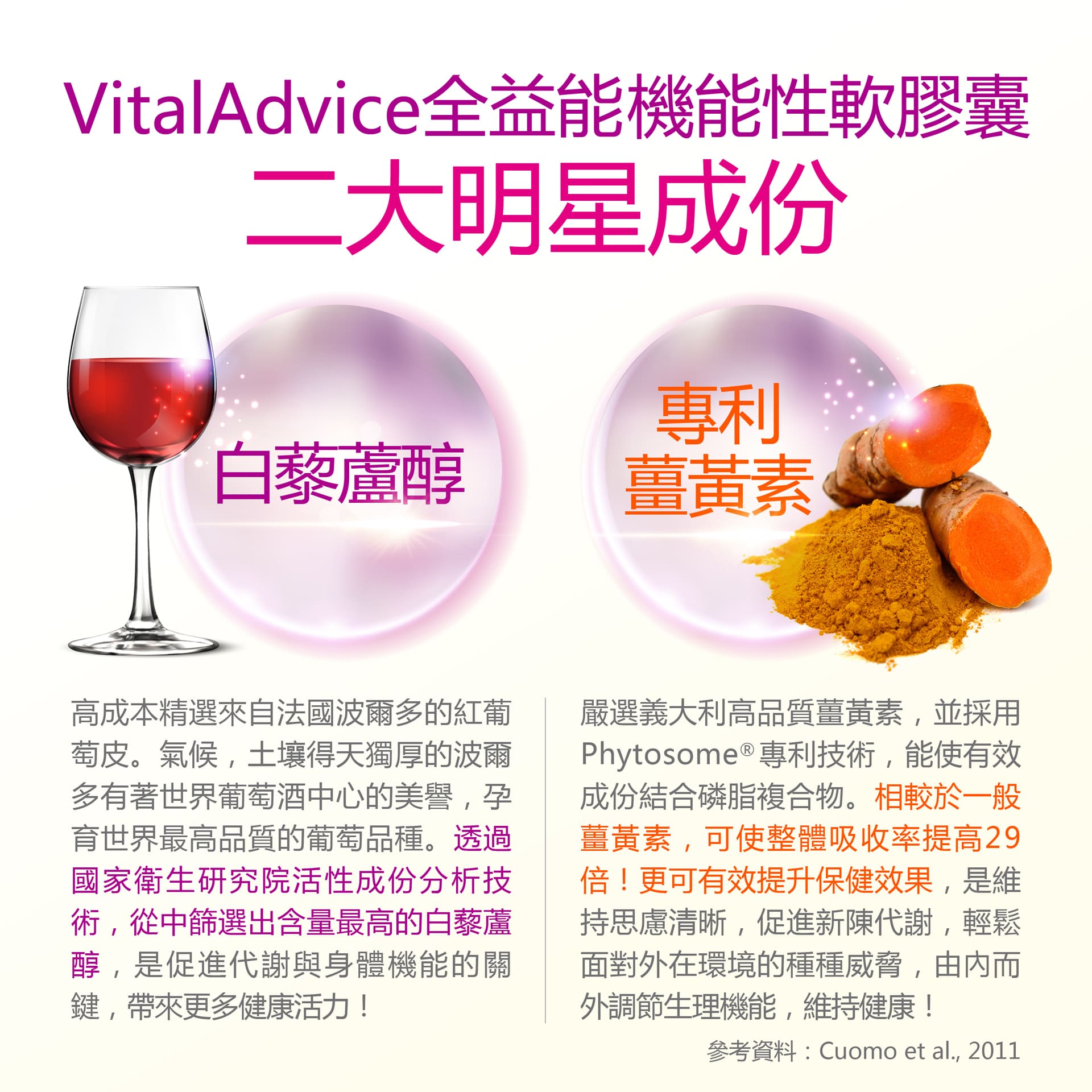 專利薑黃萃取物(含薑黃素)、苦瓜萃取物、定位酶解大豆胜肽、紅葡萄皮萃取物(含白藜蘆醇)、綠藻精粉...等作用